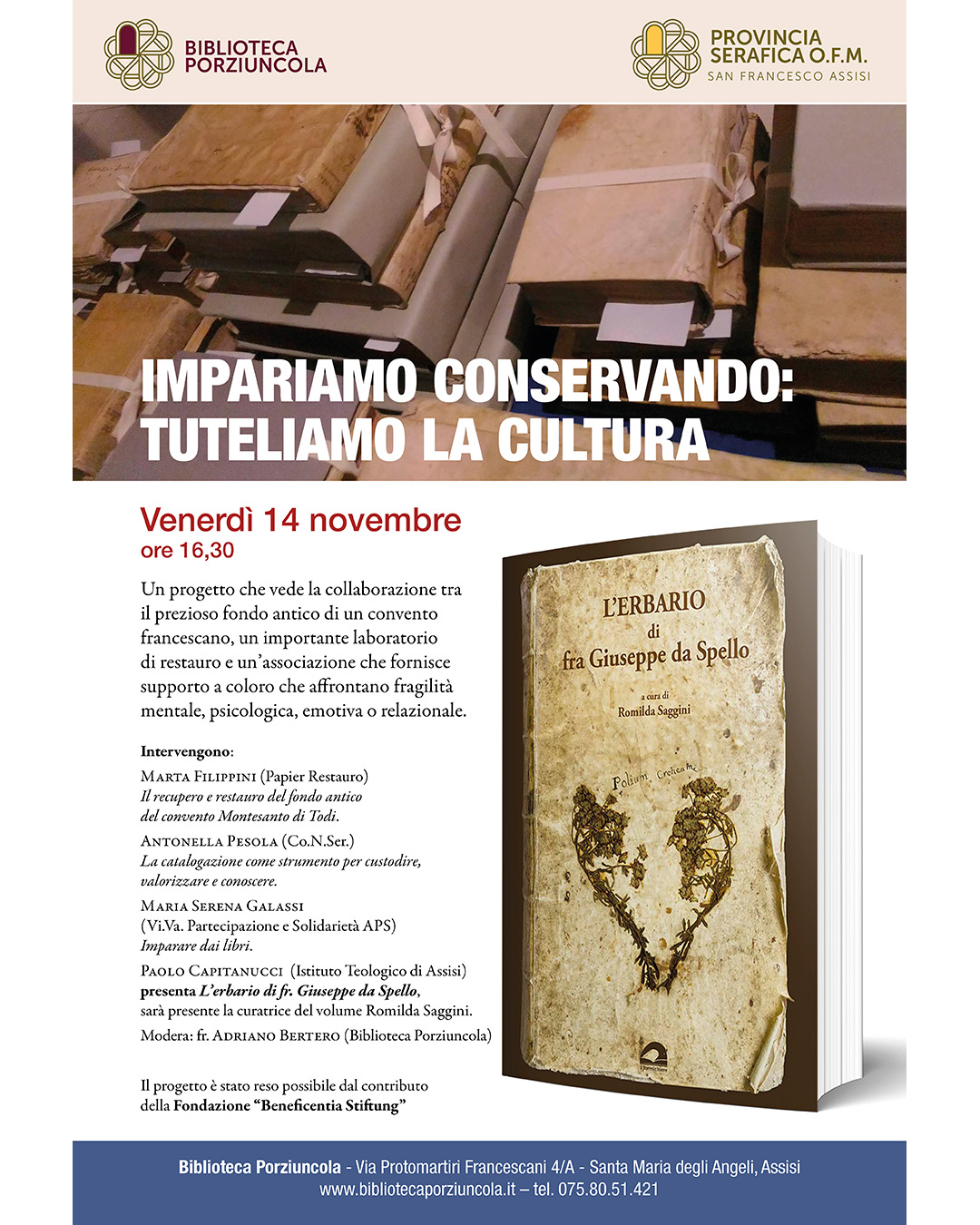 Oggi la Biblioteca Porziuncola raccoglie i vari tronconi della vecchia biblioteca, alcuni notevoli lasciti, come quello del Padre Nello Casalini, del Padre Giacinto Cinti, del Padre Emanuele Testa, nonchè numerose altre pubblicazioni rimaste accumulate, dopo gli eventi sismici del 1997.